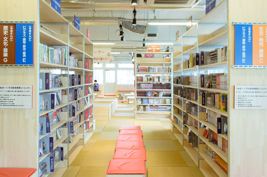 ジャンル別に蔵書を展示しています。押入れ風の読書スペースなどでご自由にお楽しみください。