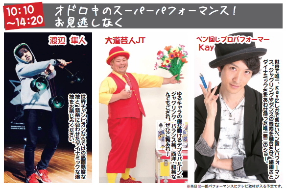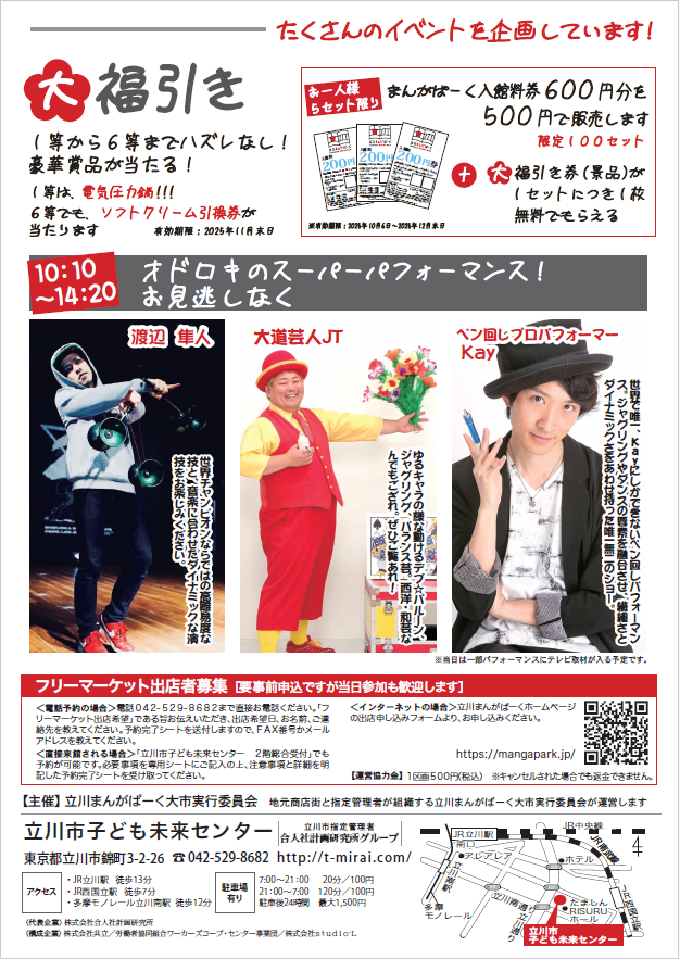 - オレンジ販売、フリーマーケット、立川産野菜の販売、古本(絵本、まんが)の販売、大道芸など
